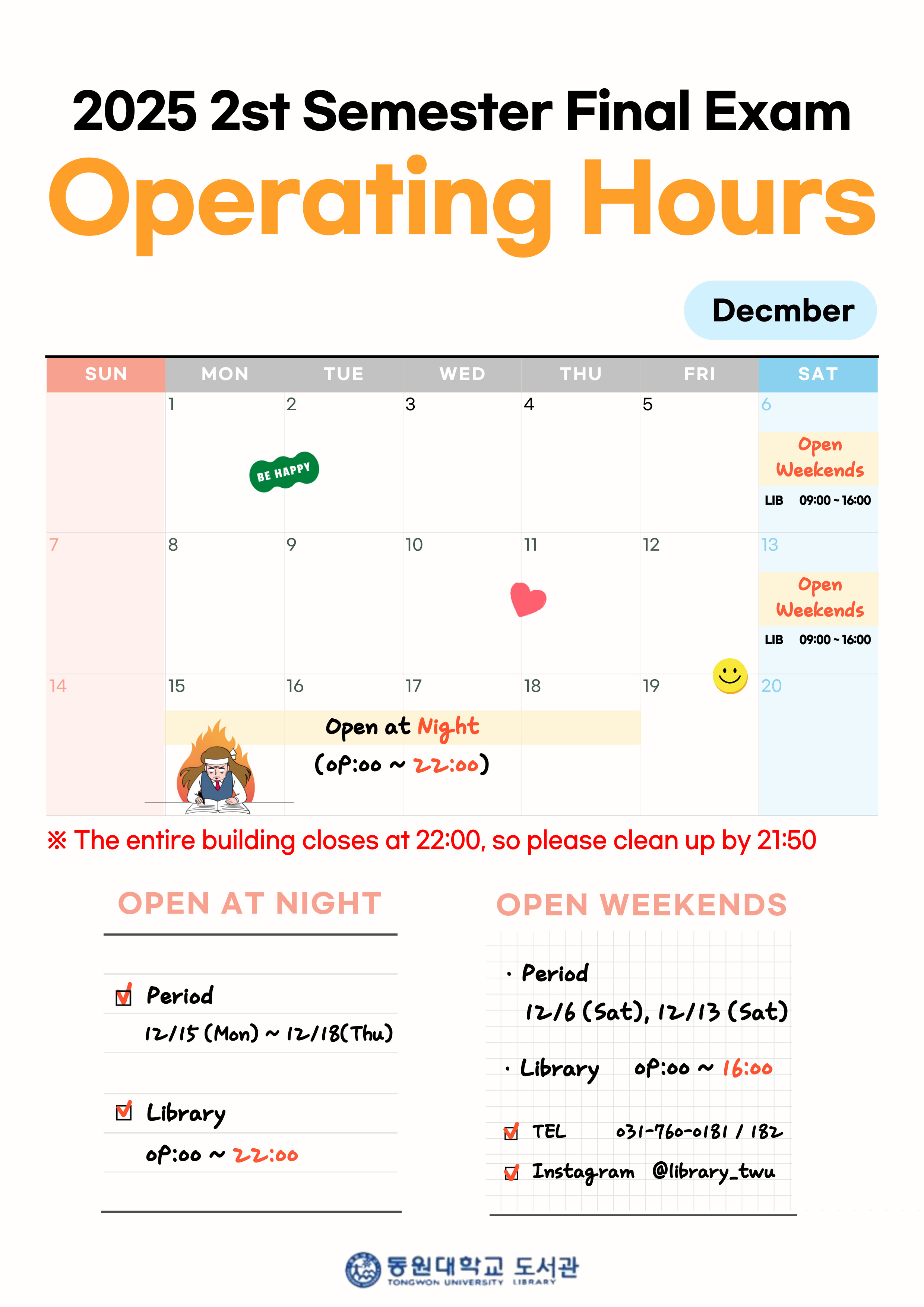 [도서관] 2025학년도 2학기 기말고사 기간 도서관 운영시간 변경 안내