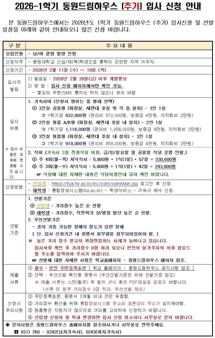 2026-1학기 동원드림하우스 (추가) 입사신청 안내